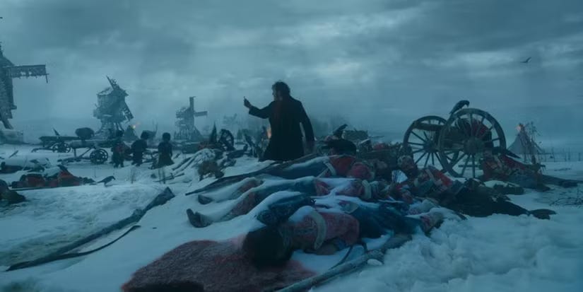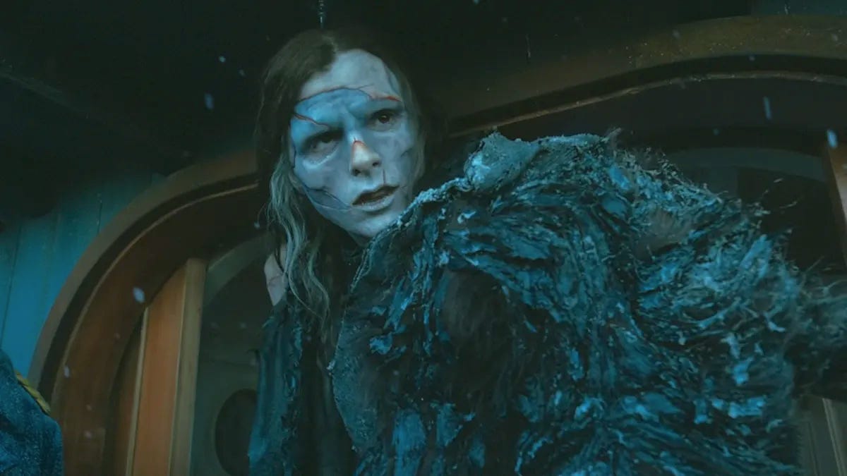 For all that, Frankenstein never becomes ridiculous. (Whether that’s a plus or a failing depends on you.) The actors chew the scenery only enough to produce a sturdy pulp. There’s less guts than anatomy, and the melodrama overheats but the engine never locks. The only moment where I wished they’d gone more camp occurs at the critical moment when the Creature, in search for his maker, comes across an envelope addressed to the doctor. With his recently acquired literacy (from a kindly old woodland blind man), we hear Elordi in voiceover pronounce the name “Victor Frankenstein” in classic Anglicized fashion, rather than Isaac’s continental style, either of which would have driven Gene Wilder to rage.